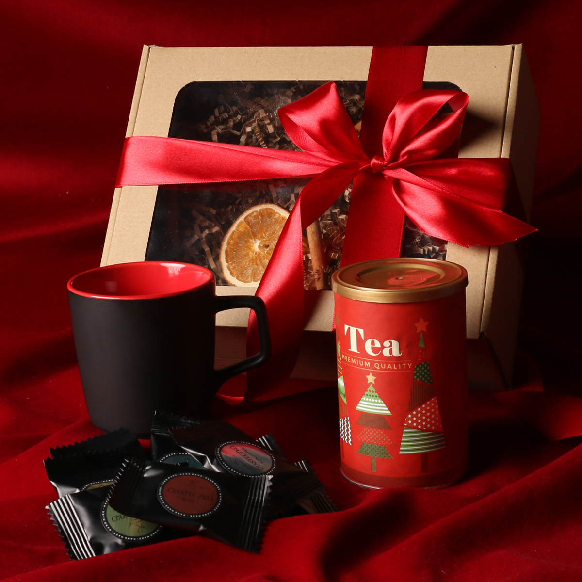W skład zestawu wchodzą: kubek Barrel Supreme czarno-czwrwony / czarny-reflex blue / czarny-czarny z możliwością zdobienia, zielona herbata Sencha z wiśniami, płatkami róży zapakowana w tubę z motywem zimowym, 8 sztuk czekoladek / ciasteczek - mix smaków. Całość w stylowym opakowaniu z tektury eco z okienkiem. Opcje dodatkowej customizacji: nadruk na kubku, bilecik z logo firmy, wstążka lub obwoluta z motywem zimowym wzbogacona złoceniem.